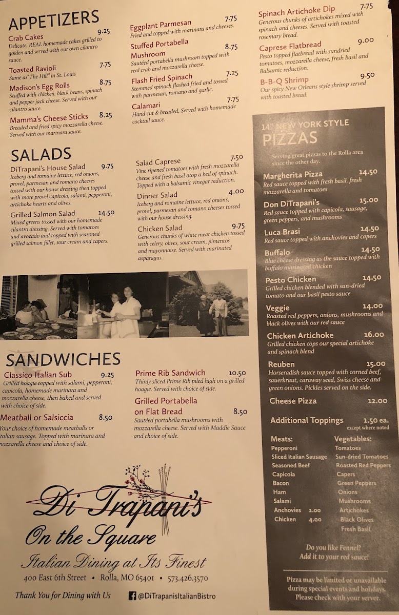 For those craving a lighter start, the Salads section features favorites like the Ditrapani's House Salad, the refreshing Grilled Salmon Salad, and the classic Salad Caprese. If you prefer something heartier, the Chicken Salad and Dinner Salad offer satisfying options.